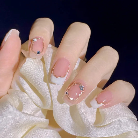 10PCS Press on Nails Pink Butterfly French Fake Nail Rhinestone False Nail Patch Short Ballet Full Cover Artificial Art Nail Tip