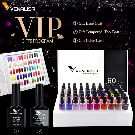 Venalisa VIP Kit Great Coverage Soak Off UV LED Nail Gel Polish Set Base Long Wear Top Coat Color Palette 60 Colors 7.5ml